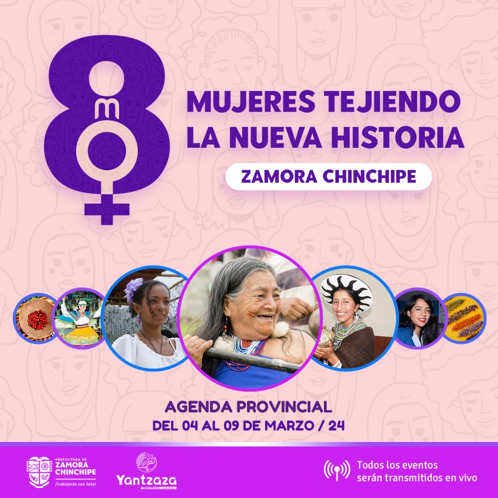 La agenda inicia este lunes 04 de marzo, con un taller de Fortalecimiento Organizativo en el Salón auditorio Gad Municipal Yantzaza a partir de las 15H00; el martes 05 de marzo, está previsto un Conversatorio de Mujeres Lideresas: “Invertir en Mujeres, Realidades y retos en el siglo XXI” en Yantzaza a partir de las 19H00, y el cual será transmitido por las cuentas oficiales; mientras que, el jueves, 07 de marzo, se realizará un Foro de Profesionales con el tema: Día Internacional de la Mujer, 8 de marzo, el cual se difundirá a través de Radio Romántica 95.7 FM a las 20H00.