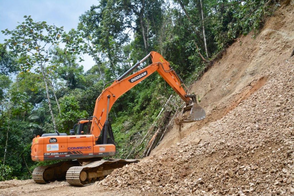 Diego Paqui, jefe de trabajos del proyecto, indicó que, se ha ejecutado el relastrado en algunos puntos, asentado de mesa, limpieza de taludes, ensanchamiento y lastrado de la misma. En esta jornada de trabajo operan: 2 volquetes, 1 excavadora, 1 rodillo, 1 tractor.