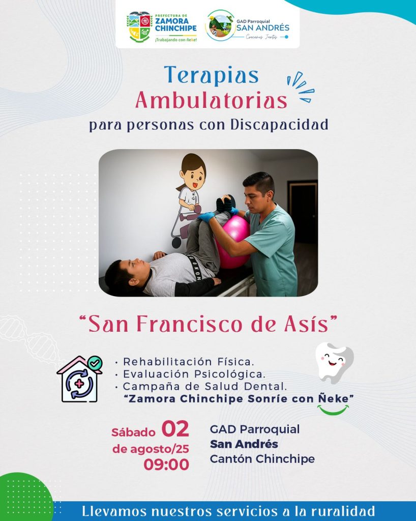 La Prefectura de Zamora Chinchipe conociendo la realidad de las familias con hijos o parientes con discapacidad, y que en ocasiones no cuentan con los recursos necesarios para movilizarlos y brindarles sus terapias, a través de la dirección de Inclusión Social y bajo el proyecto “San Francisco de Asís”, continúa acercando los servicios a las zonas más alejadas de la provincia, en esta oportunidad por primera vez la atención llega a la parroquia San Andrés, el día sábado 2 de agosto a partir de las 09:00 am en el Gobierno Parroquial.